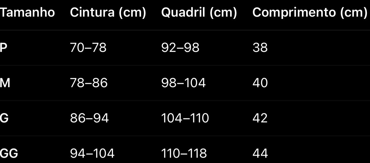 O cós com elástico reforçado modela o quadril e mantém o short firme, sem apertar.